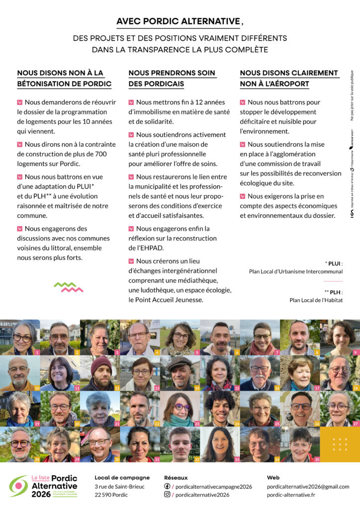 Le dimanche 22 mars 2026 vous retrouverez le bulletin de vote pour Pordic Alternative 2026 et ce dernier appel pour une ville apaisée, tournée vers l’avenir.